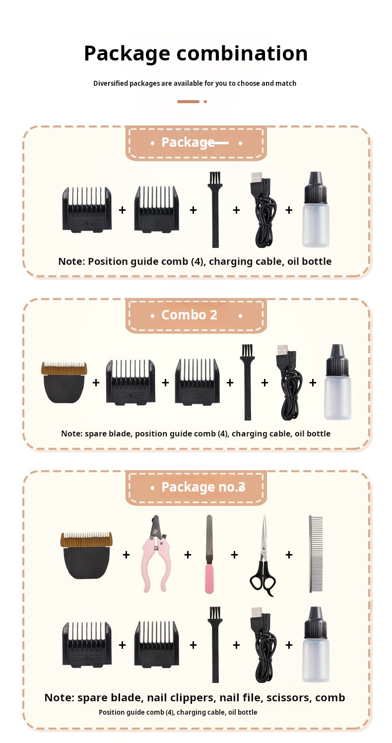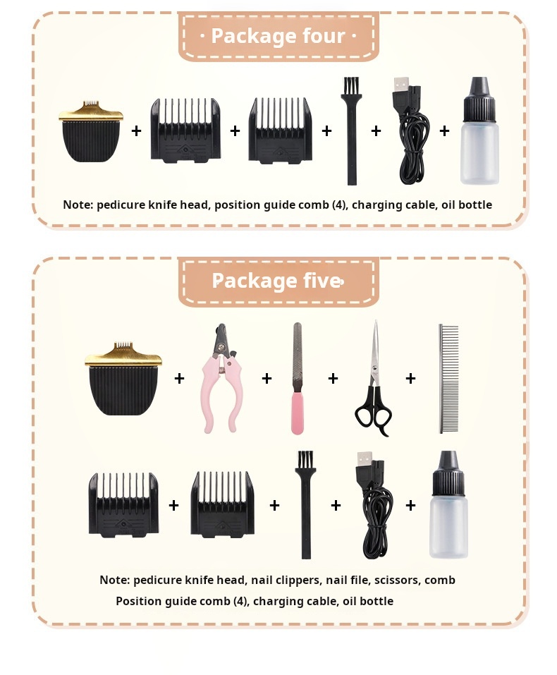 • Complete Kit for Pet Grooming: 4 PSC limit comb (3/6/9/12mm) , 1 PC Comb, 1 PC Scissors, 1 PC Small Knife Head, 1 PC Depilatory Glove, 1 PC USB Charging Cable, 1 PC Cleaning Brush, 1 PC Tool Kit, 1 PC Instruction Manual.
