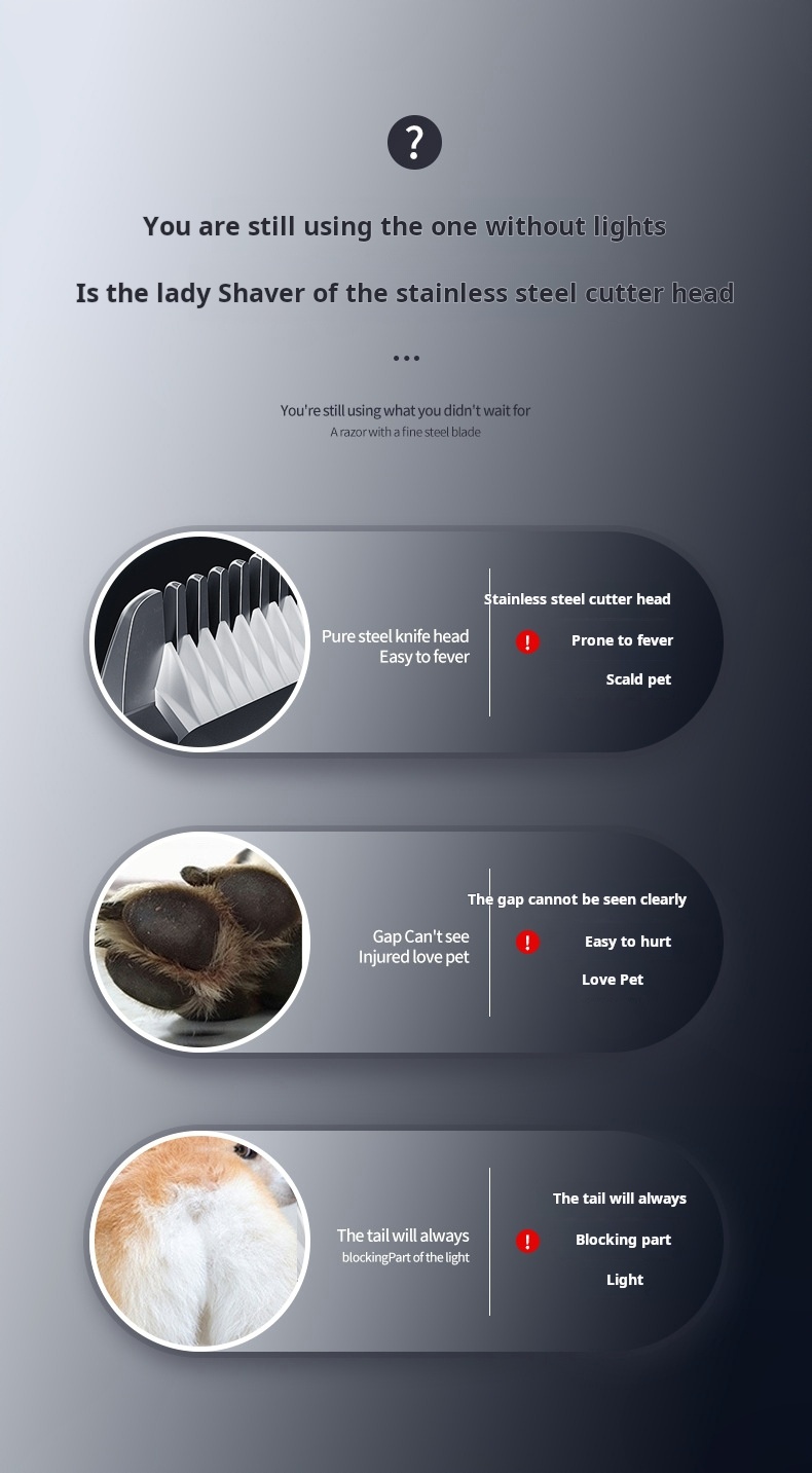 Traditional clippers risk overheating, scare pets with loud noise, and lack visibility. we solves these issues with its cool-running blade, gentle operation, and LED illumination—making grooming safer, faster, and stress-free.