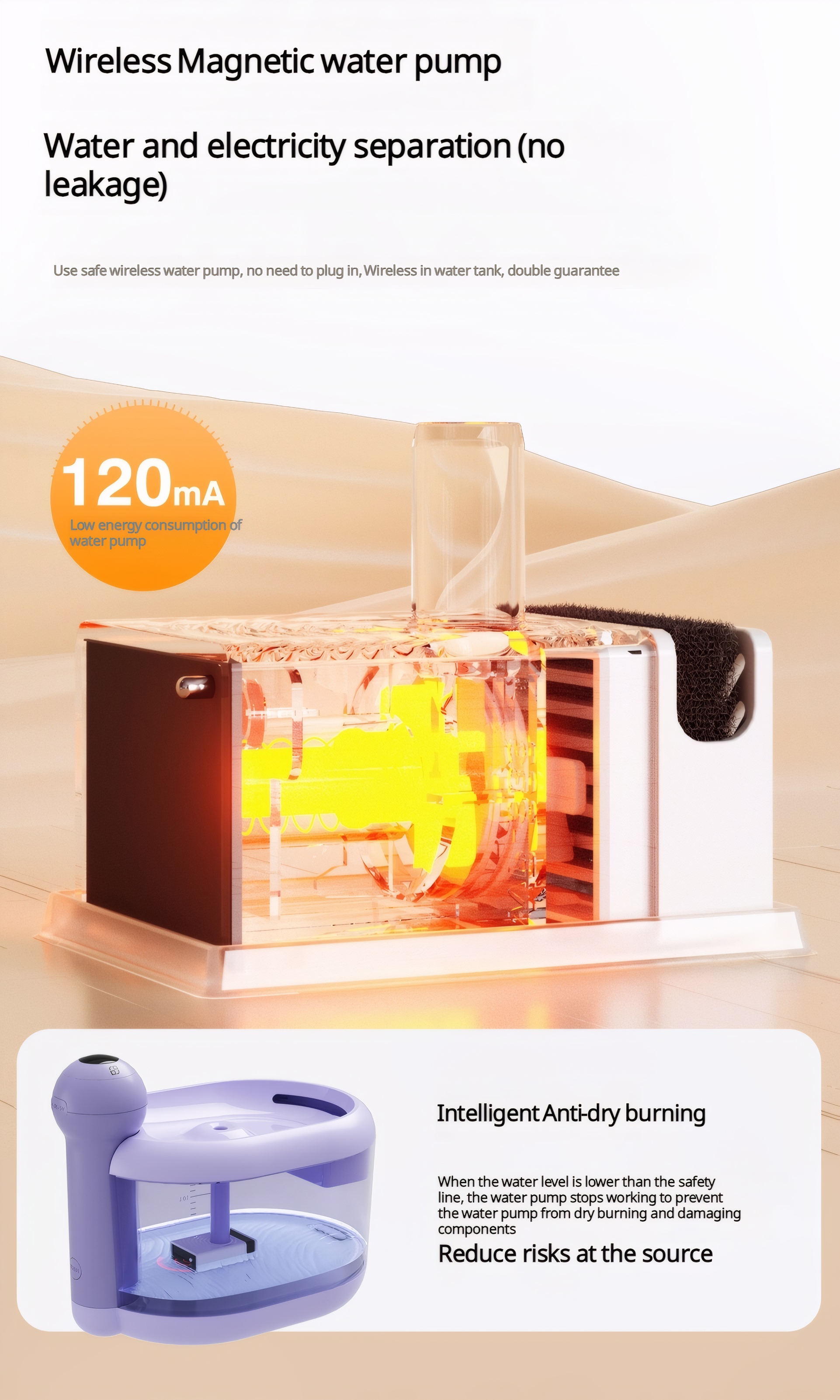 • Wireless magnetic sensing water pump, anti-dry burning, water and electricity separation without leakage