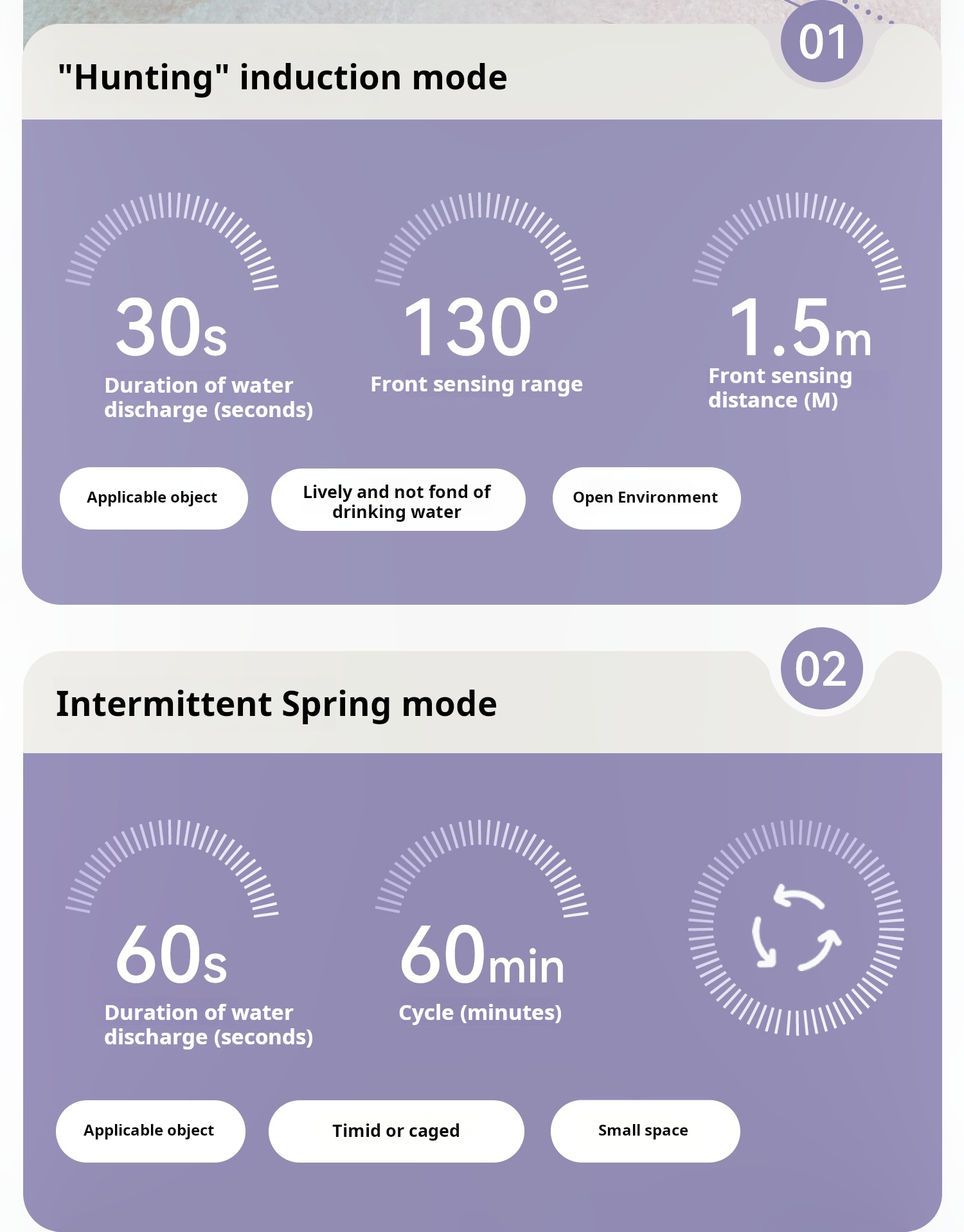 • Sensor mode meets the curious nature of cats and stimulates the interest of drinking water, newly upgraded microwave radar sensing to prevent false triggering and longer lasting power.