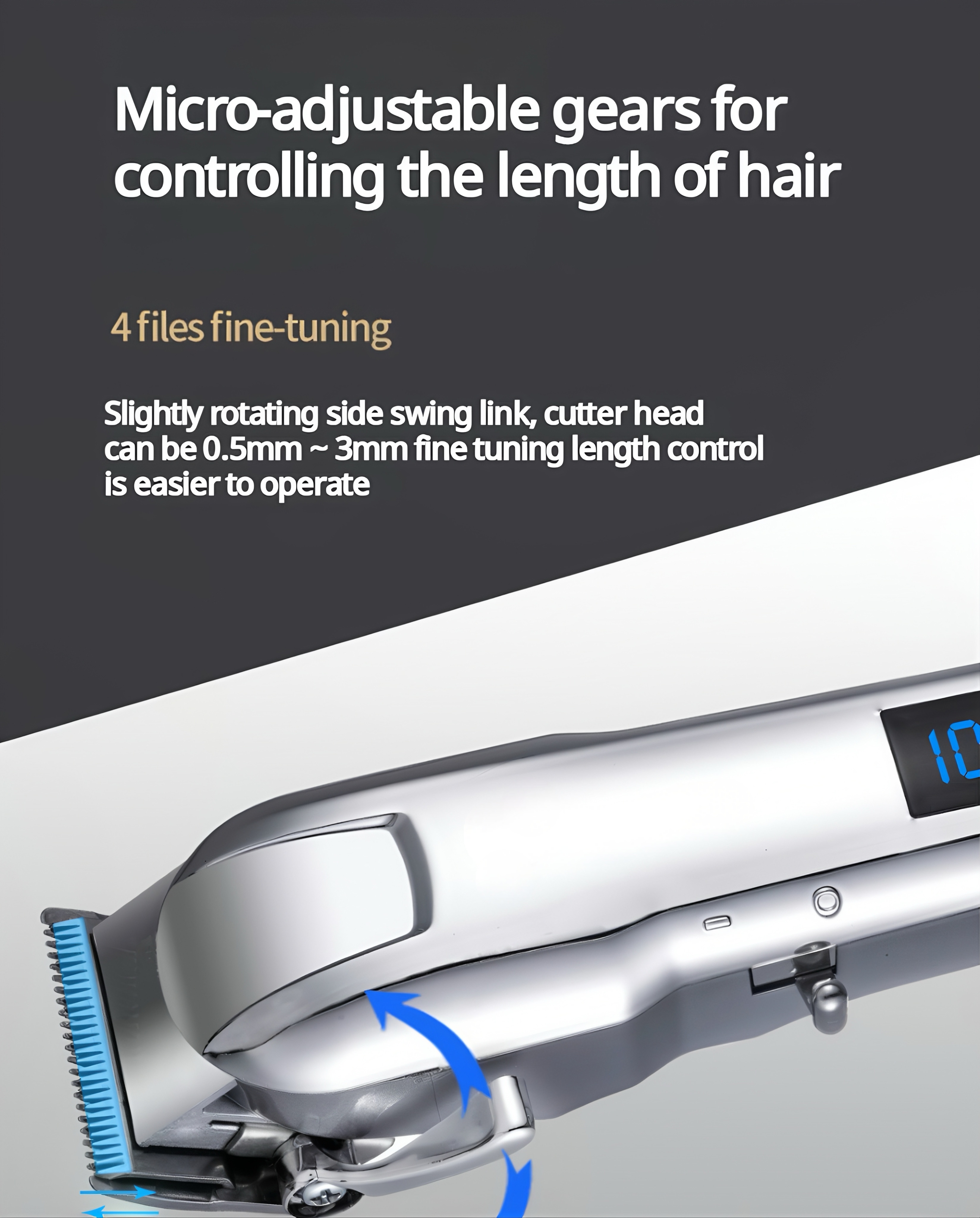· 4-Level Blade Adjustment (0.5mm–3mm) – Easily adjust cutting length with the side rocker for layered styling and precise control.
